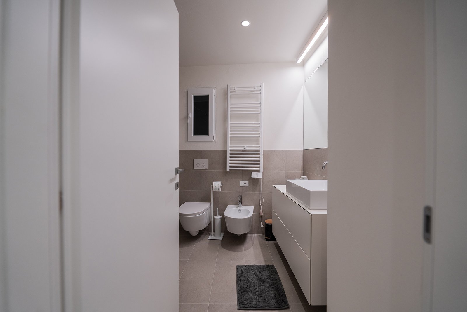 Il bagno è ampio, moderno e ben rifinito, completo di doccia, bidet e tutti i comfort necessari.