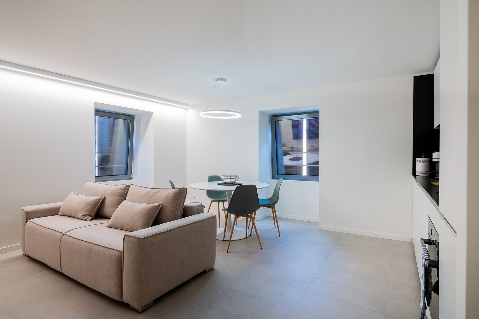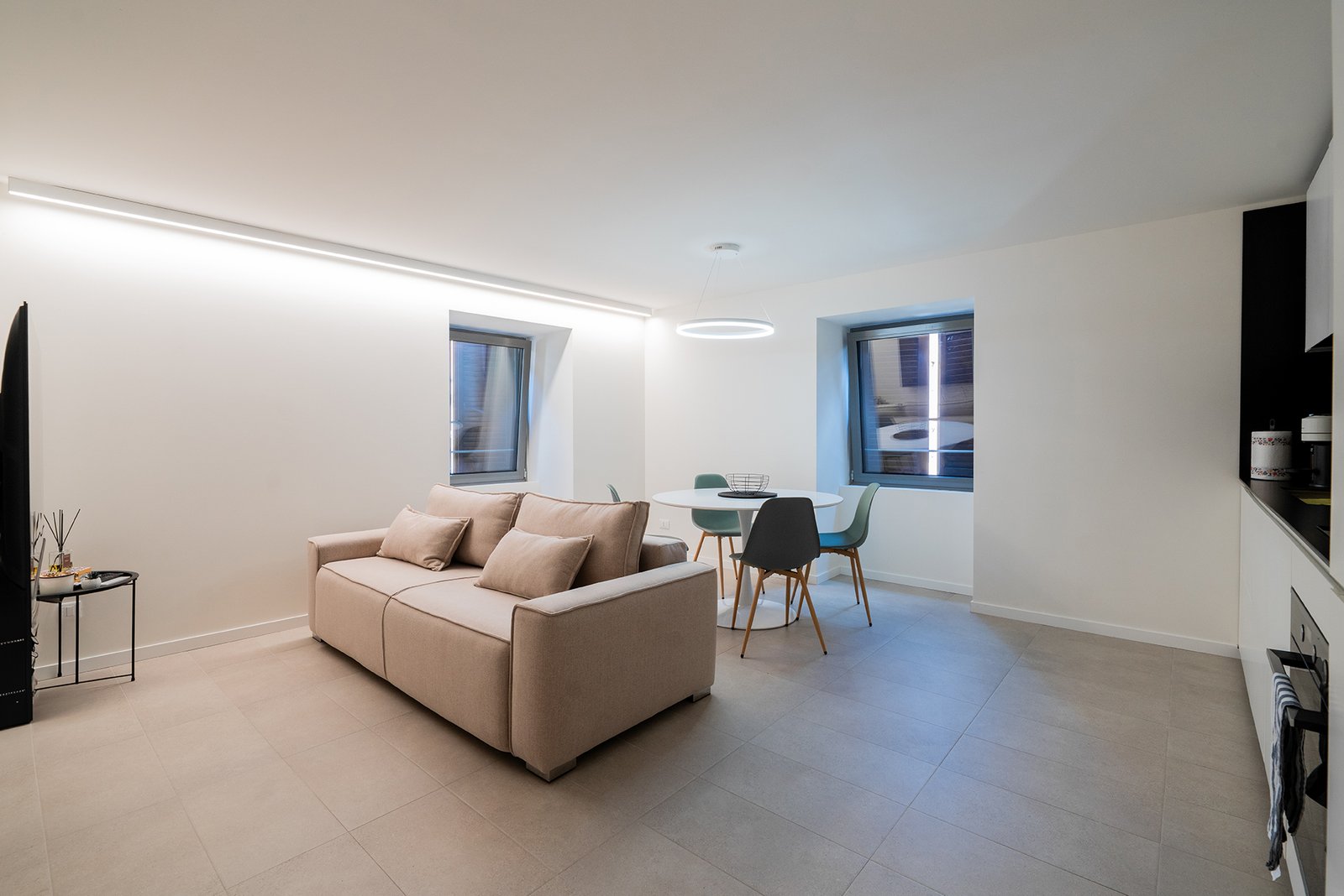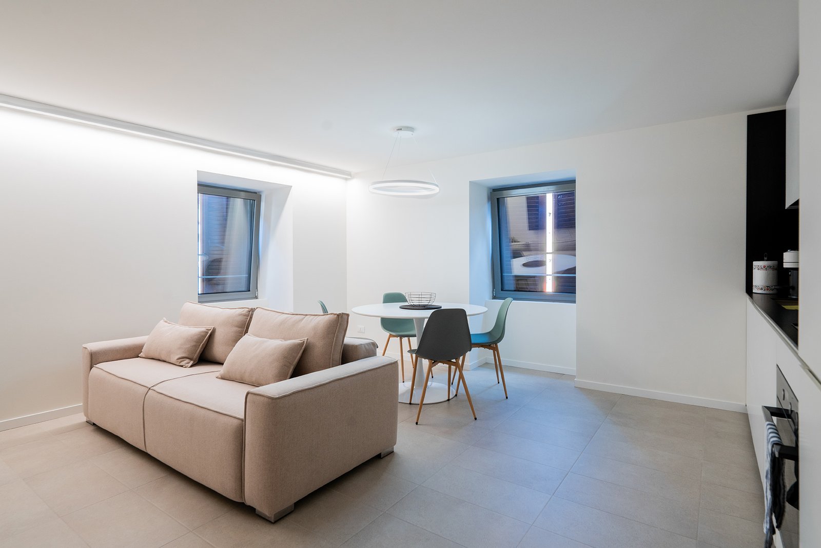 L’appartamento si apre poi su un luminoso soggiorno con cucina a vista, arricchito da due finestreche donano luce naturale durante tutto il giorno. La cucina è completamente accessoriata: lavastoviglie, lavatrice, macchina del caffè, frigorifero, piano cottura e tutti gli utensili essenziali per sentirsi come a casa, anche per soggiorni più lunghi.