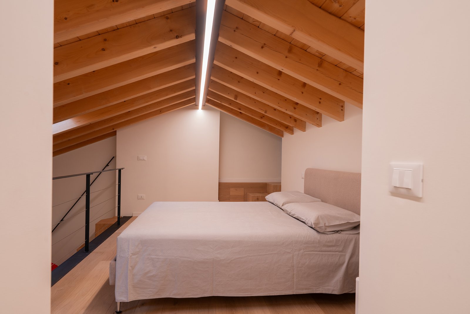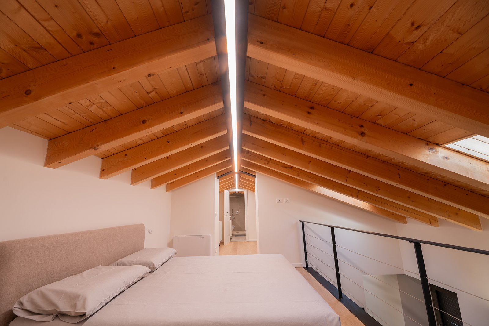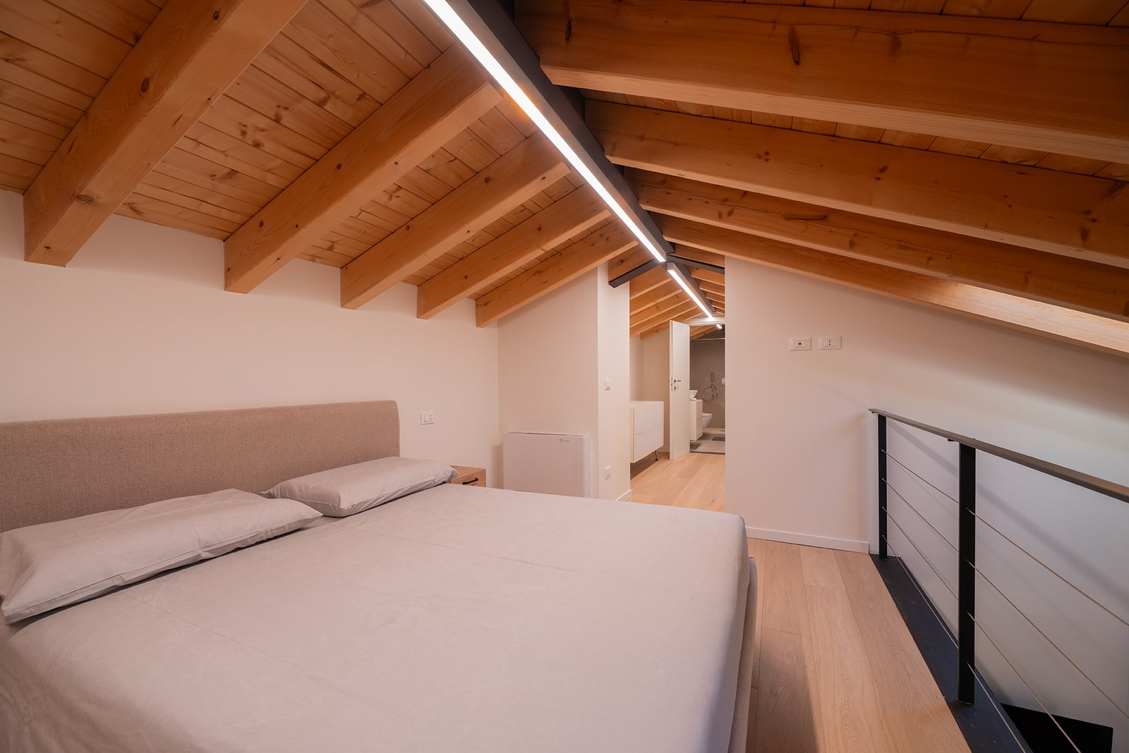 All’ingresso dell’appartamento, una scala in legno conduce al soppalco superiore, dove si trova una seconda camera matrimoniale, intima e suggestiva, con bagno privato en-suite, anch’esso completo di doccia e bidet.