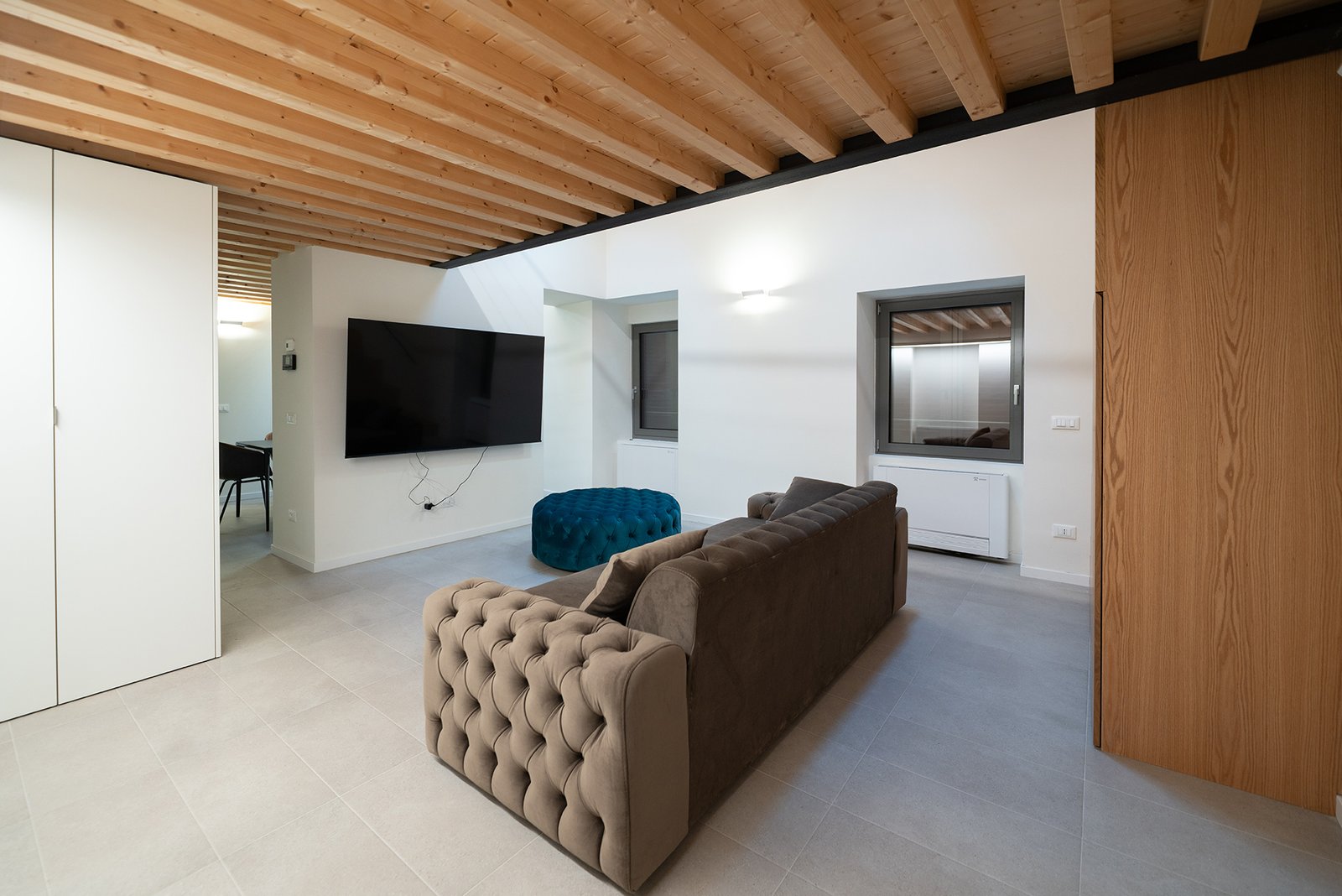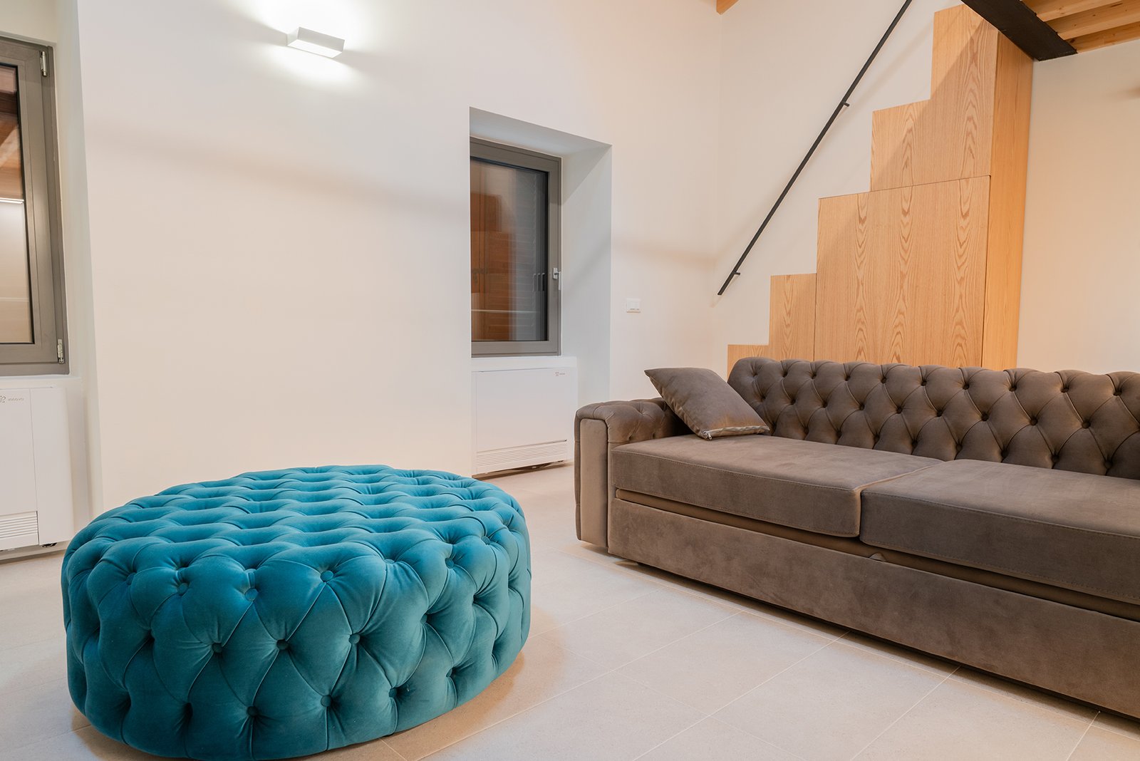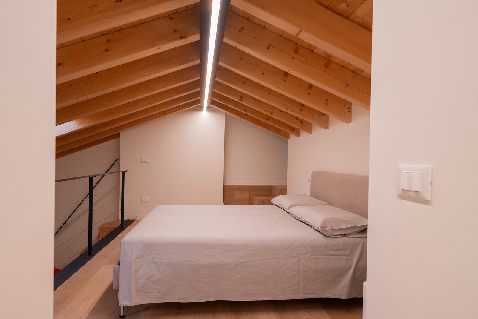 All’ingresso dell’appartamento, una scala in legno conduce al soppalco superiore, dove si trova una seconda camera matrimoniale, intima e suggestiva, con bagno privato en-suite, anch’esso completo di doccia e bidet.